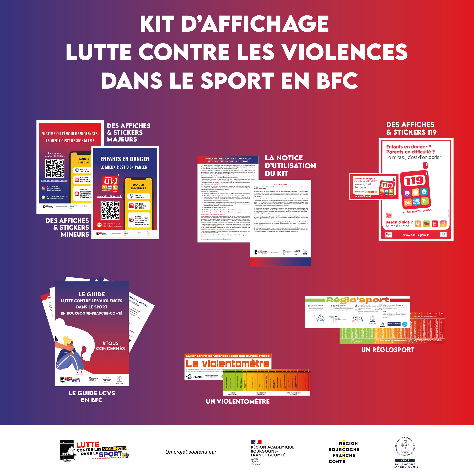 Le contenu du kit d'affichage a pour but de venir en aide aux personnes victimes et/ou témoins de violences et de sensibiliser les dirigeants, bénévoles et/ou professionnels à la lutte contre les violences dans le sport.