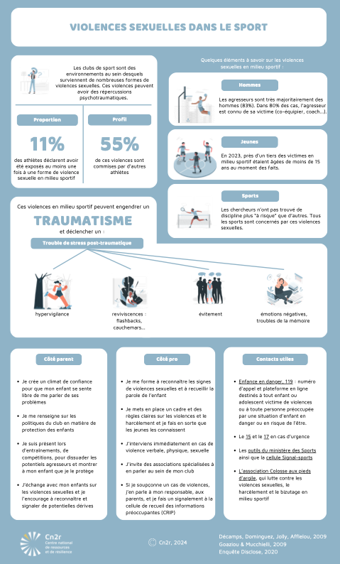 Cette affiche présente des faits à connaître sur les violences sexuelles dans le milieu du sport. Les chiffres clés, les traumatismes, les contacts utiles sont mentionnés ainsi que les messages clés adressés aux parents et aux professionnels sportifs.