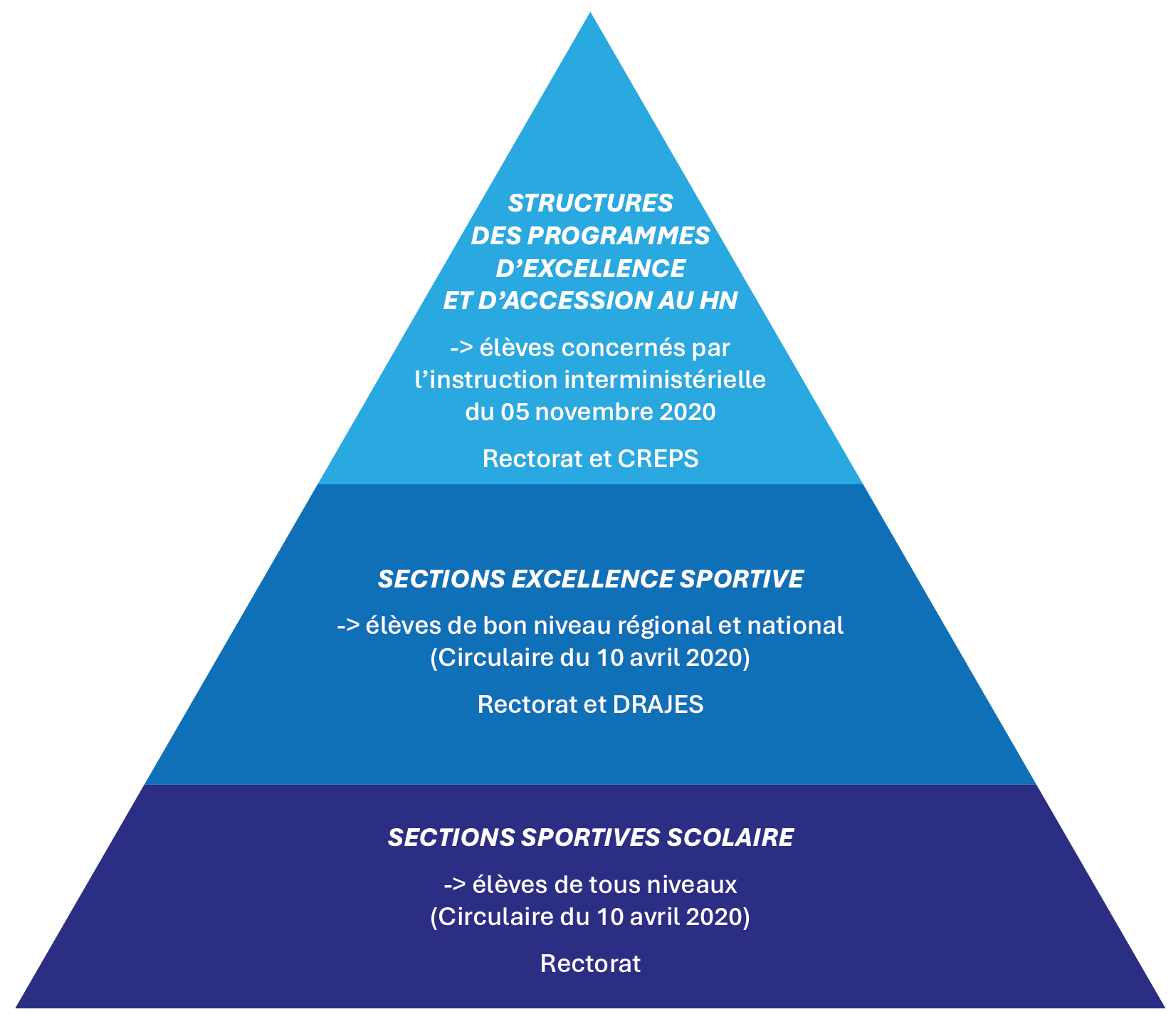 En milieu scolaire, l'accès au haut niveau sportif peut schématiquement être représenté par un fonctionnement pyramidal à trois étages :